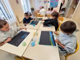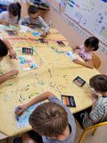 Les classes de CE1 et CP-CE1 ont la chance de pouvoir travailler avec une artiste, Cécile White ( cecilewhite.fr ) dans le cadre du PEL. Elle vient tous les jeudis pendant 8 séances pour échanger avec les enfants sur des oeuvres d'artistes autour du thème " jour et nuit" et pour leur faire pratiquer des techniques différentes.
