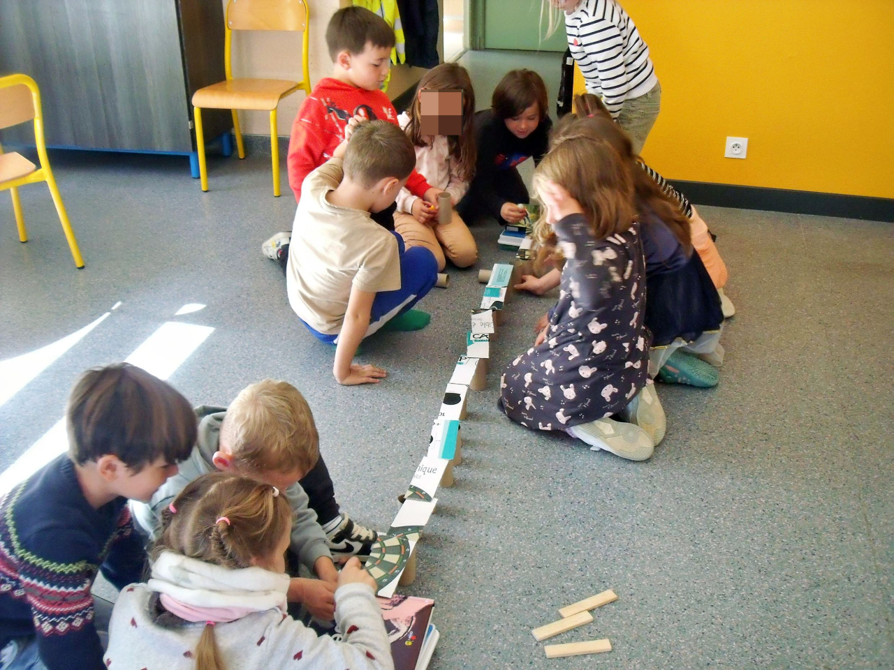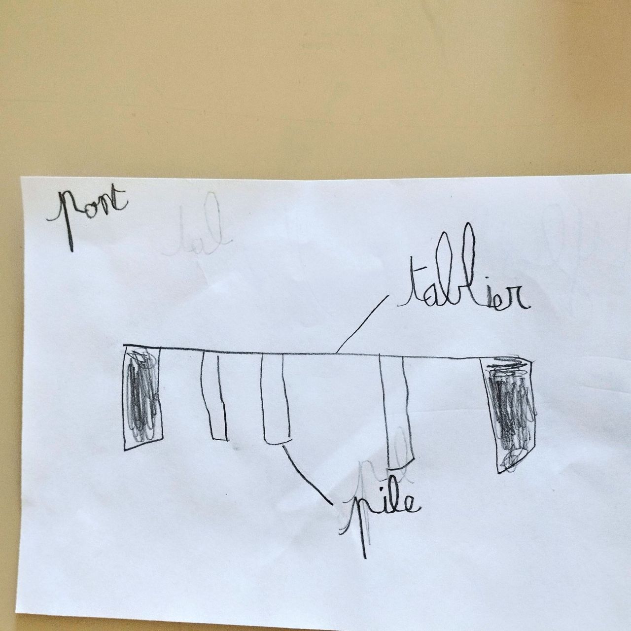 Dans le cadre de la semaine de la science, les CP d'Emmanuelle ont relevé le défi "construire un pont pour aider un personnage à se rendre d'un endroit à un autre"en respectant le cahier des charges. Après avoir schématisé leur première idée "qu'est-ce qu' un pont?", les élèves ont découvert, grâce à différents essais, la démarche expérimentale, le vocabulaire technique d'un pont, les différents ponts existants.